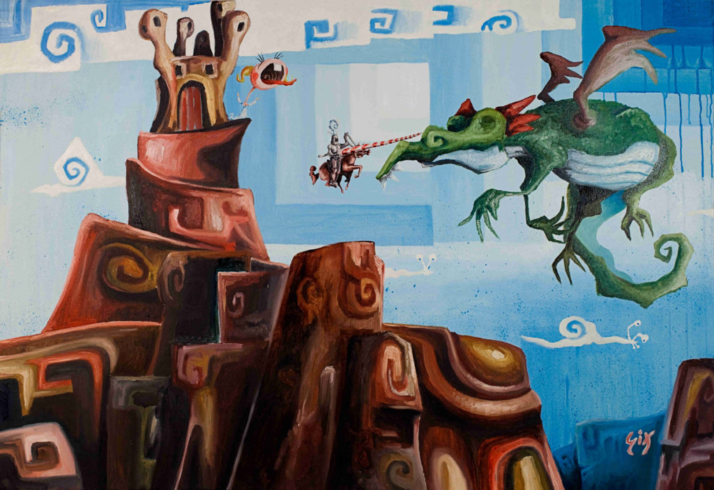 This painting in oil on canvas features a dreamlike scene of a fable. The princess is defended by a valiant chevalier fighting against a green dragon with wings that are far too small to fly.